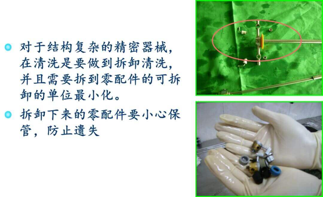 機器清洗并不能全部代替手工清洗,對于某些管道、精密儀器和較難清洗部位必須手工清洗,此外對于清洗設備必須經(jīng)常清洗和保養(yǎng)以免機器清洗失效。